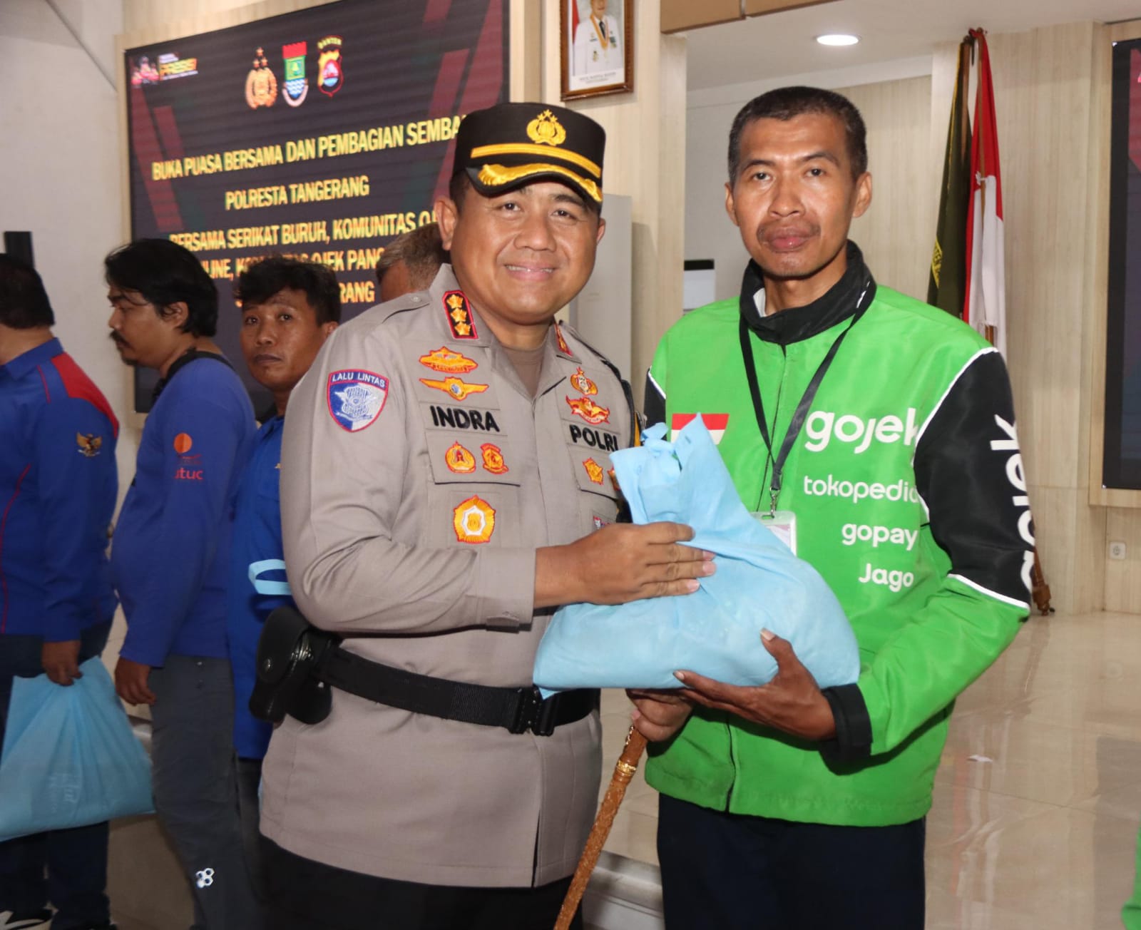 PelitaTangerang.com, Tangerang – Polresta Tangerang membagikan bantuan paket sembako kepada para pengemudi ojek online (ojol) dan ojek pangkalan (opang) di Gedung Serba Guna (GSG) Puspemkab Tangerang (Puspemkab), Kamis (12/3/2026).